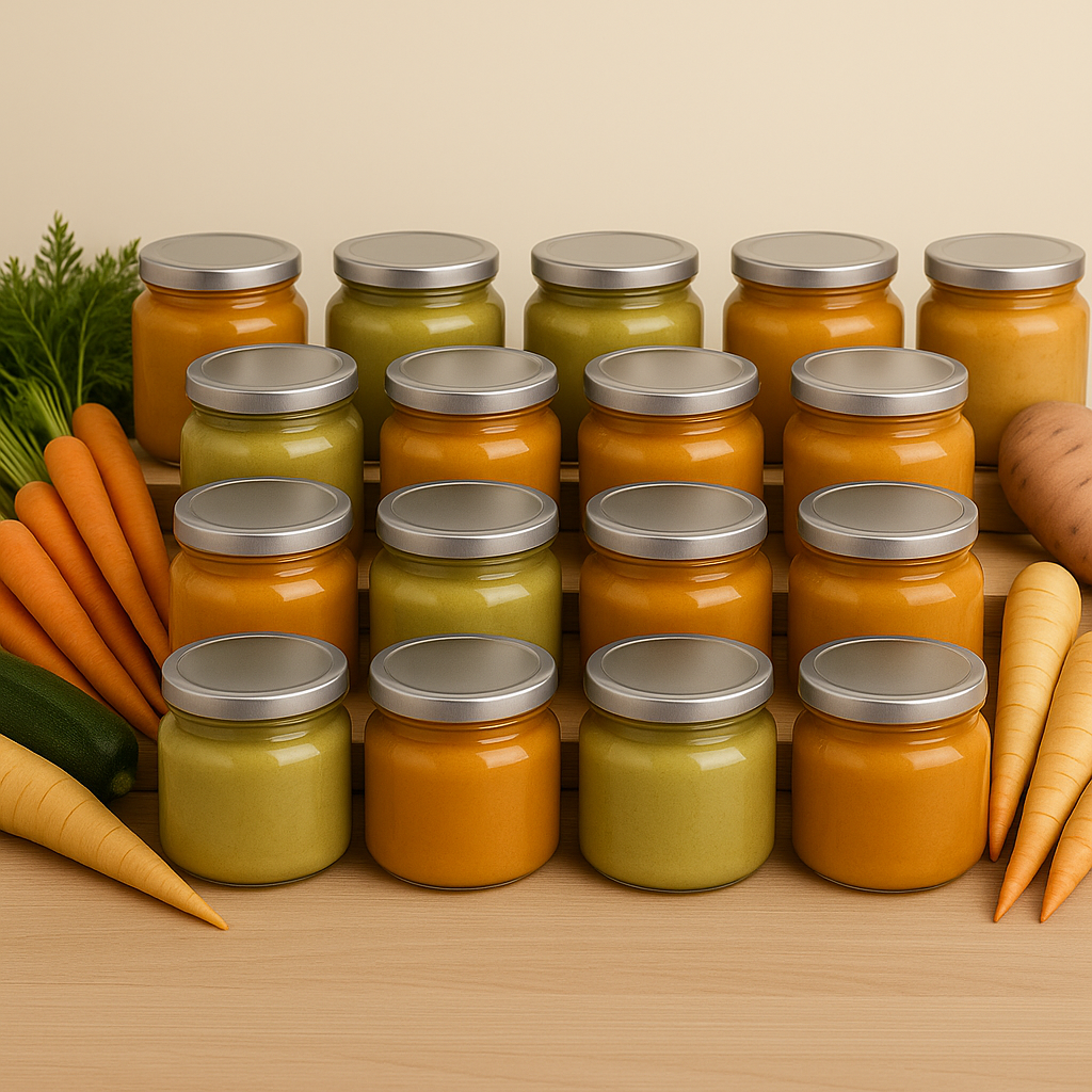 ⚖️ 28 petits pots : 14 purées de 150g + 14 veloutés du soir de 100g
